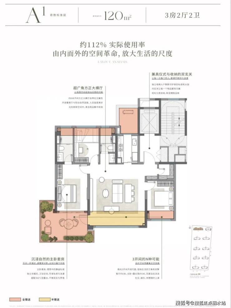 刚刚我也拿到一手资料,项目户型图全网首发!这是建面约120㎡户型,实际使用了约112%,120㎡住出150㎡的从容和舒适,客厅开间约6米,妥妥大平层尺度;豪华主卧套房,还带南向延伸露台,丰富生活体验。而同面积段的另一户型,露台放置在客厅阳台外,可以根据自己的喜好,自由选择。