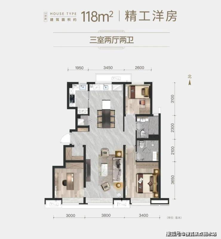 至于建面约118㎡的三室两厅两卫洋房户型,则可以匹配改善客群的需要。