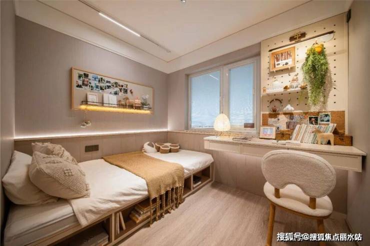 次卧实现多功能均衡,定位家庭加油站,可以作为阅读、办公以及收藏兴趣爱好的空间。