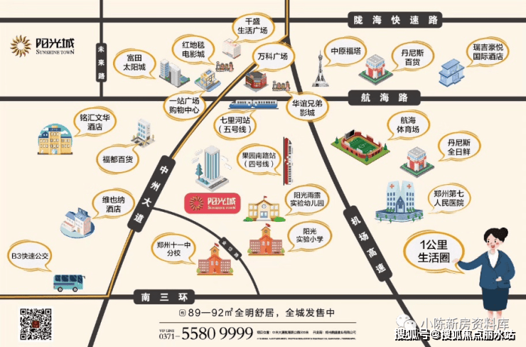 中州大道、南三环、机场高速、陇海快速路围合,奢享半小时都市生活。4号线、5号线双地铁,为生活提速:5号线七里河站步行10分钟之内可达;4号线果树所站纵贯项目内部,百米距离。
