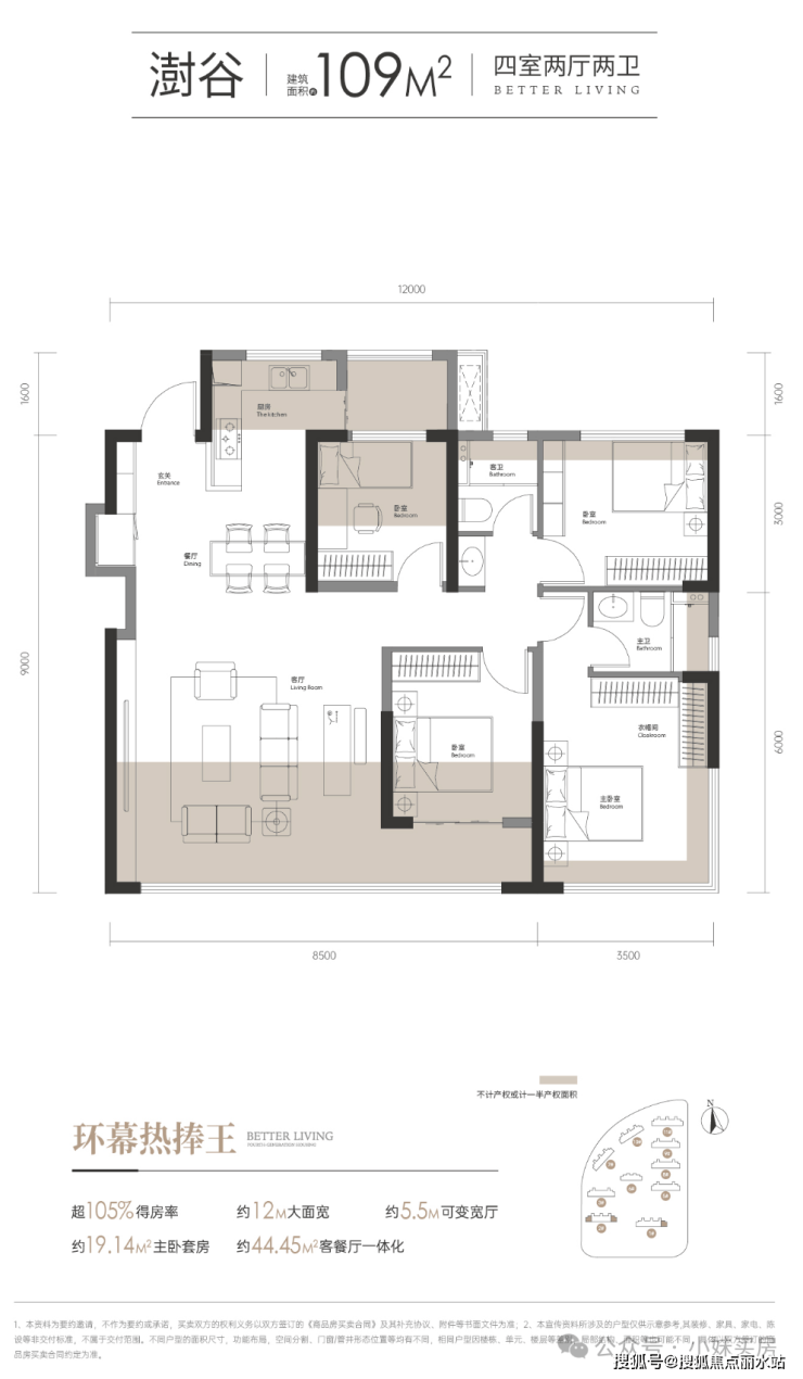 首先,105%的得房率,妥妥的负公摊,对于主城区四代住宅来说,还是非常高的(目前三环内准四代项目得房率能达到95-97%左右就已经算相当优秀了)