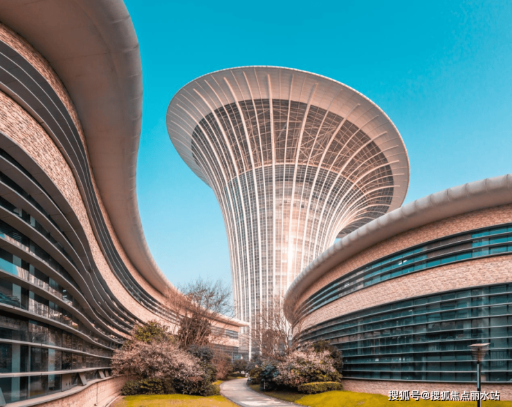 光谷独一份的香槟金铝板立面,在阳光下折射出细腻质感;难度极高的大圆弧转角,搭配竖向铝板柔美的“飘带”线条,让建筑自带艺术气场;