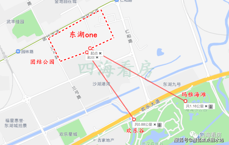 休闲娱乐上,项目二期隔壁就是一个13万方的市政公园——团结公园,距离东湖直线距离约1公里,欢乐谷、玛雅海滩都在东湖边。