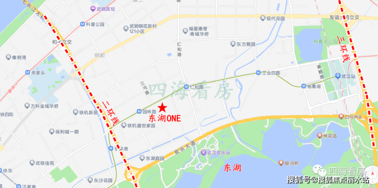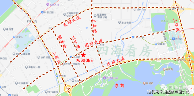 东湖ONE位于洪山区团结大道与三弓路交汇处,在楼市板块中属于徐东北仁和路板块,距离二环线1公里,距离三环线4公里,距离东湖也只有1公里,属于二环边。