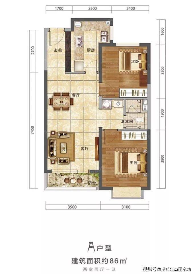 86是唯一的两居室小户型,户型方正无死角,做到了动静分离、干湿分离,厨房设计的也较好,采光和通风都没什么大问题;唯一要注意的是卫生间没有独立窗口,会比较潮湿,不过洗手台和洗衣机的位置在卫生间门外,使用起来较方便。