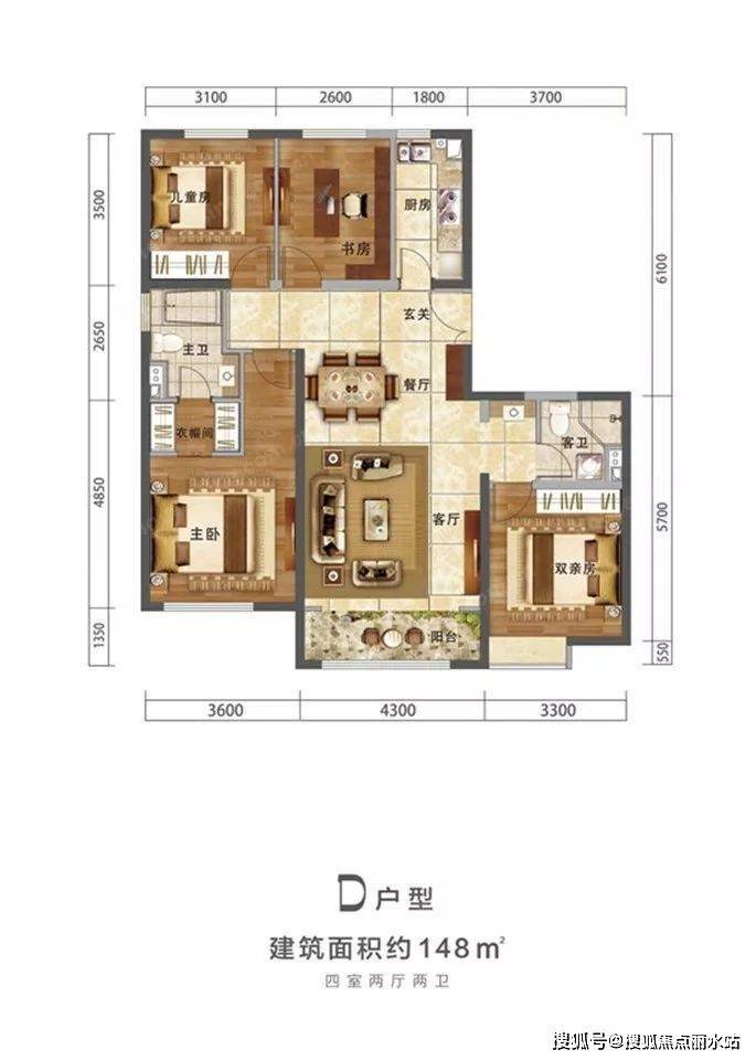 148虽然面积最大,但没有亮点。南北通透全明户型,通风良好,双卫生间做了干湿分离,但功能区布局杂乱,儿童房和书房使用卫生间不方便。