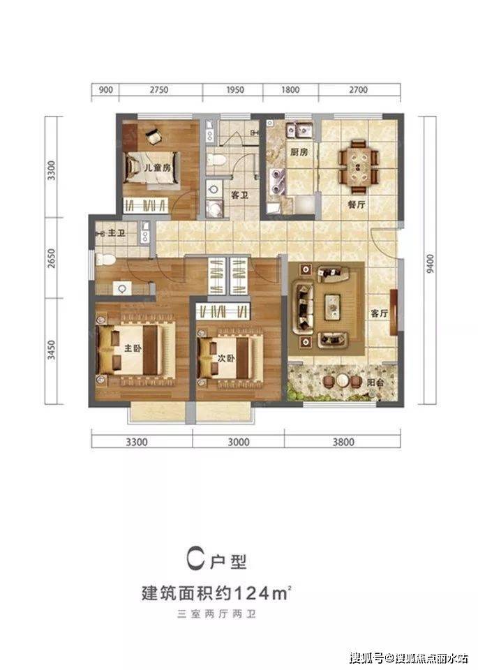 124的户型方正,三面朝阳、南北通透、动静分离,两个卫生间都做了干湿分离,独立洗手台和洗衣机的区域也方便使用,但是卧室门口东西向的走廊直通入户门,占用了客厅的面积,还要注意夏季防晒。