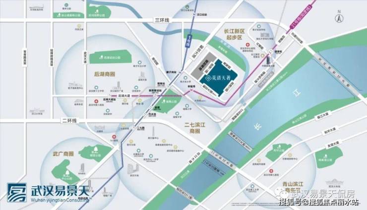 【未来规划】:汉口城区段,长江主轴左岸,二七滨江旁,千亿规划长江新城起步优先发展区,未来城市样板地块位于武汉三环内江岸区堤角板块,紧邻二七滨江商务区,同时占据长江新区门户核心区位,同享汉口繁华、新区发展红利,于繁华之上阅见城市新生。