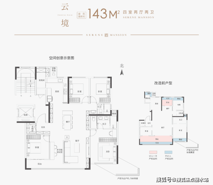 143㎡户型为例,图中粉色面积赠送一半,蓝色面积全赠送,实际得房面积在143㎡——这相当于过去建筑面积180㎡的户型。