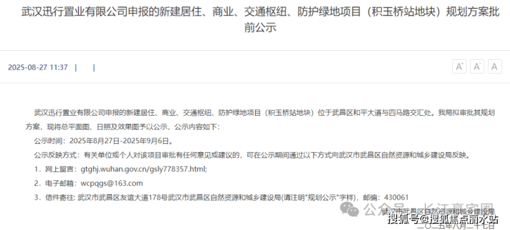 武汉迅行置业有限公司申报的新建居住、商业、交通枢纽、防护绿地项目(积玉桥站地块)规划方案批前公示,该项目也就是武汉地铁集团积玉桥项目,如今终于浮出水面了!