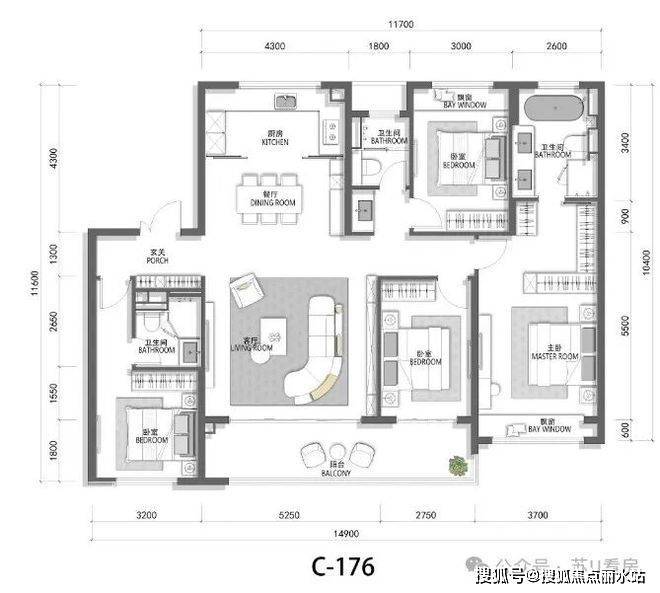 餐客厅阳台组成LDKB超大社交方厅,近80㎡的奢阔,约6.9m的客厅加上三个卧室,近乎是5开间朝南。