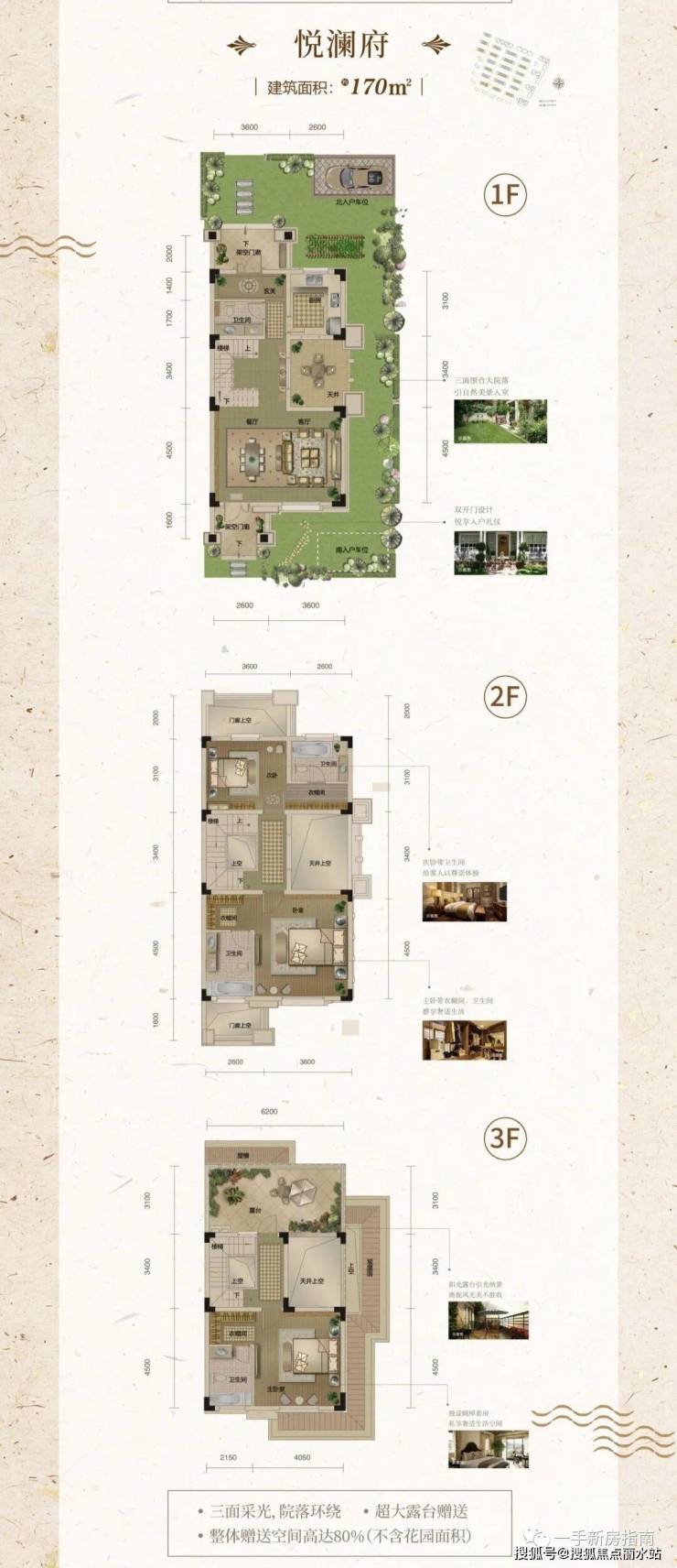 ◆ 超高赠送 (院子约54-326㎡,室内门廊及天井中空赠送约49㎡,露台赠送约19㎡,合计约121-394㎡赠送面积)。