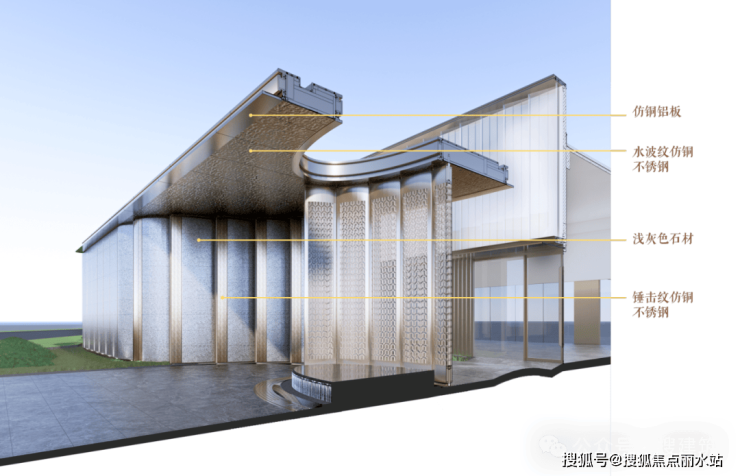 入口门头以气质文雅的浅灰色蓝眼睛石材为立面主材,弧形石材片墙渐次偏转角度排列,围合成半圆形入口灰空间。