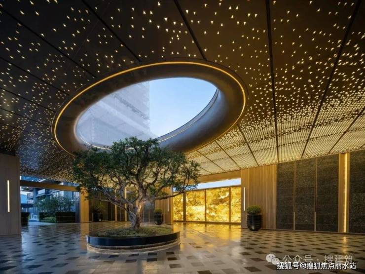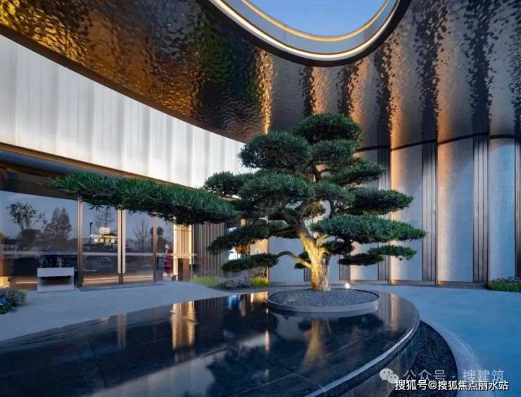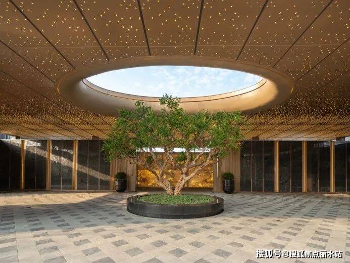 主入口超大跨度圆形镂空穹顶下,一棵特选造型石榴树引领入口的仪式感,强化了界面设计和人性化体验。植物有机的形态成为开放空间的图腾,使空间充满盎然生机,也表达“丰收、富贵、多子多福”的美好寓意。