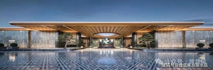 示范区阔绰主门头东西横跨超33m,高约6m,屋檐设计采用古典建筑语言,气势恢弘;严谨的中轴对称布局,强化空间的尊崇礼序感。横向延伸的长庭作为过渡空间,柔化了归家大堂与城市区域之间的界限。