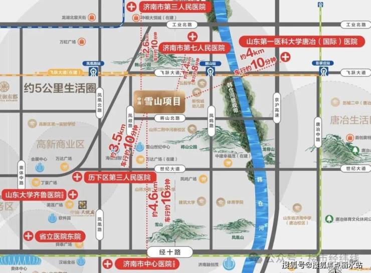 “三横三纵一轨道”路网成熟,三纵:凤鸣路、凤岐路、凤凰路,三横:经十路、飞跃大道、世纪大道;距离地铁R2号线鲍山站仅约800米;距离4大产业区(CBD、高新软件园、汉峪、奥体)约5-8公里,黄金通勤圈。