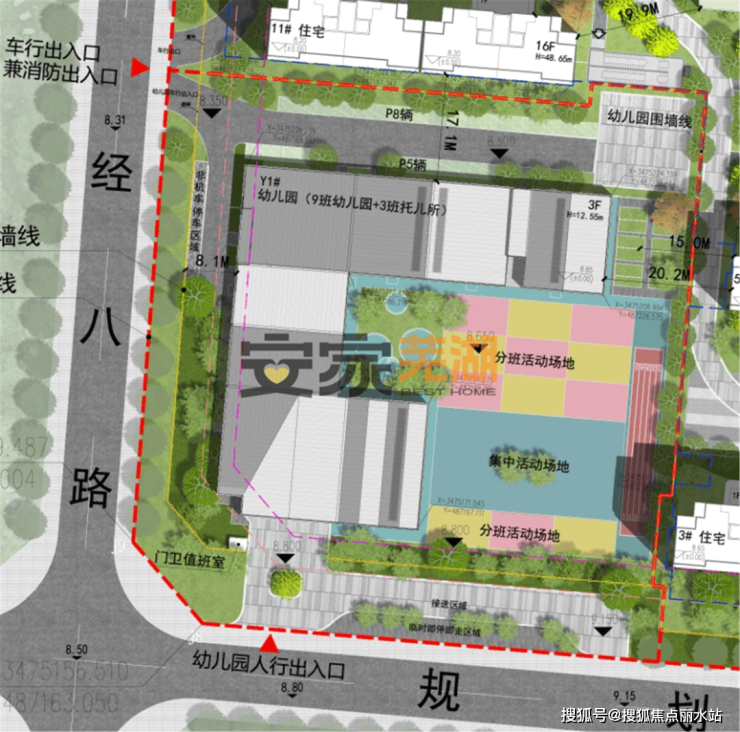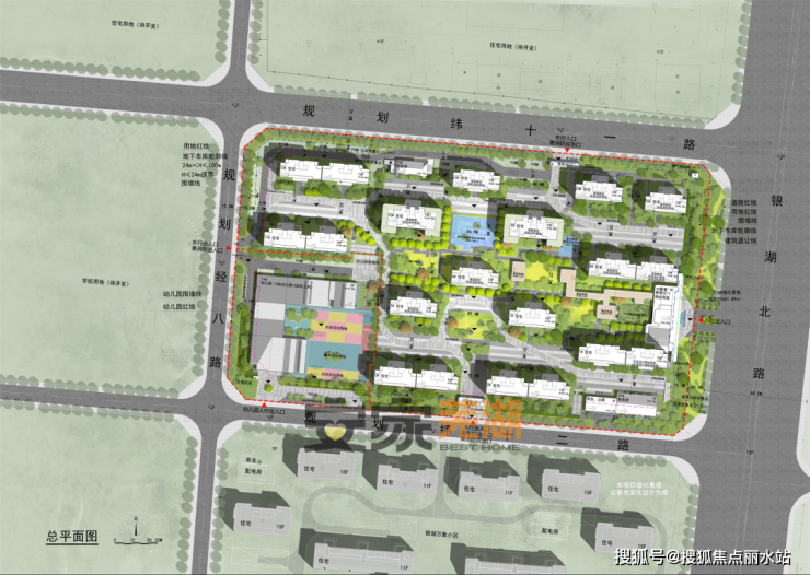 小区西南角规划了一处9班幼儿园+3班托儿所,位于规划经八路与规划纬十二路交叉口。