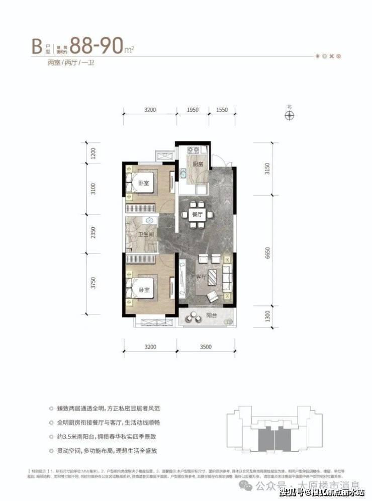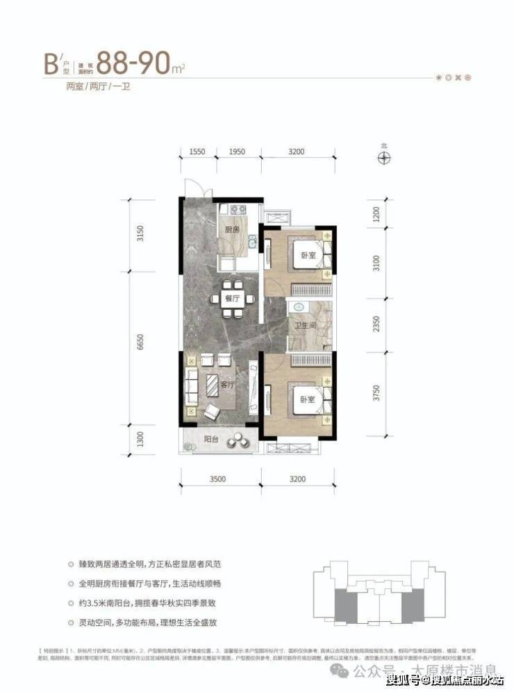 金泰苑,户型有两居88平和三居120平。两居为中间户,南北通透,北侧有连廊。120平为东西把边户,南北大通透,客厅朝东或者朝西,北侧无连廊。户型设计都很不错。虽然东户有紫气东来之说,但是西户可以看太原北城中轴线,夜景效果特别棒。