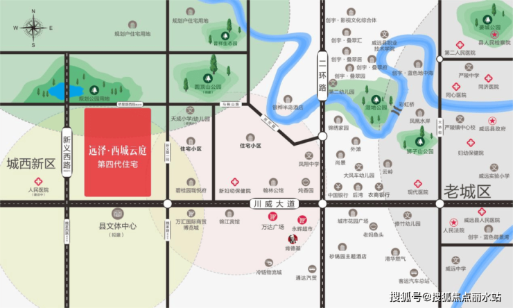 城西热土,蓬勃发展,商圈荟萃,欣欣向荣。远泽·西城云庭紧邻川威大道,毗邻规划建设中的威远县文体中心(六馆一院);板块内汇聚万达商圈、凤翔中学、县人民医院新区、妇幼保健院、天成小学/幼儿园(建设中)等优质配套;项目北侧,紧邻圆顶山公园(规划待建)及多个市政公园。坐拥一城精粹配套,雄踞威远未来高端生活新C位。