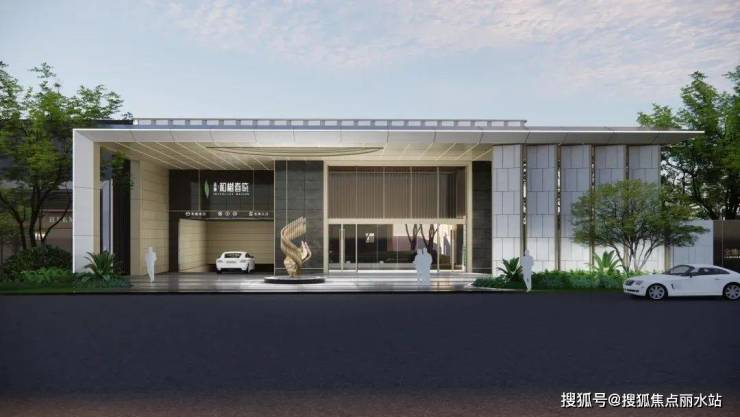 ①重新升级的大门采用金地独有的“归家院子”模块,人车分流设计,约30米宽、约9米高,恢弘气派。加上大门上方约7米高、10米深的超大尺度悬挑雨棚,配合门前艺术品雕塑、花园绿植,升级为一个媲美五星级豪奢酒店的归家大门。