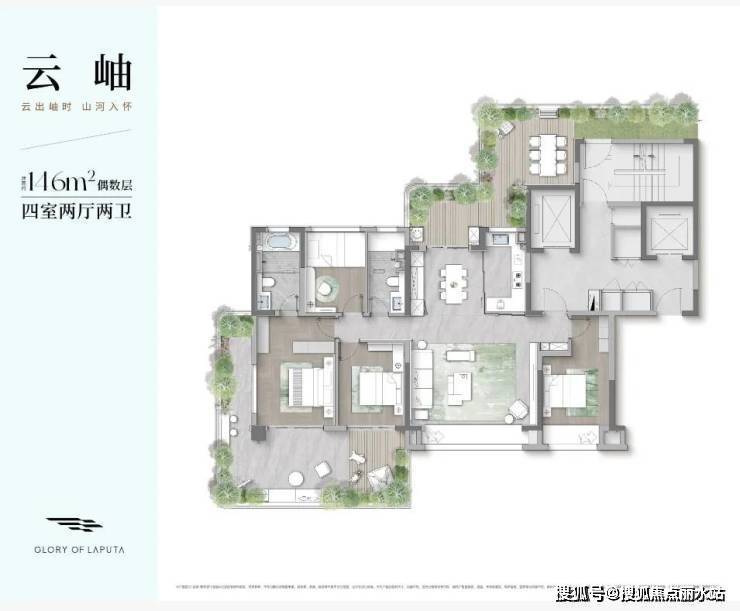 其中,建面约146㎡户型打造为四房两卫,偶数层配备南向L型超大空中庭院,四开间朝南,三卧室南向布局,北侧还规划有庭院空间,通透敞亮。