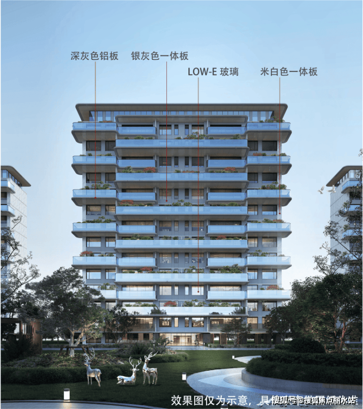 从外立面效果图可以看出整体采用深灰色铝板+银灰色一体板+米白色一体板+LOW-E玻璃,尽显通透现代之感。