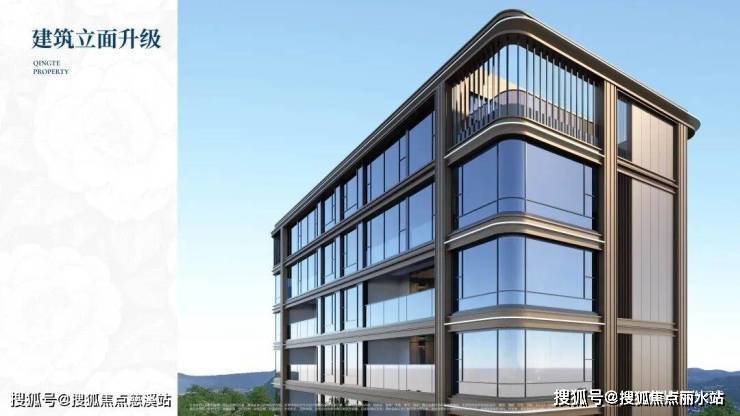 建筑立面采用南向铝板+LOW-E玻璃,搭配香槟金色金属线条,整体轻盈现代,充满镜面艺术感。