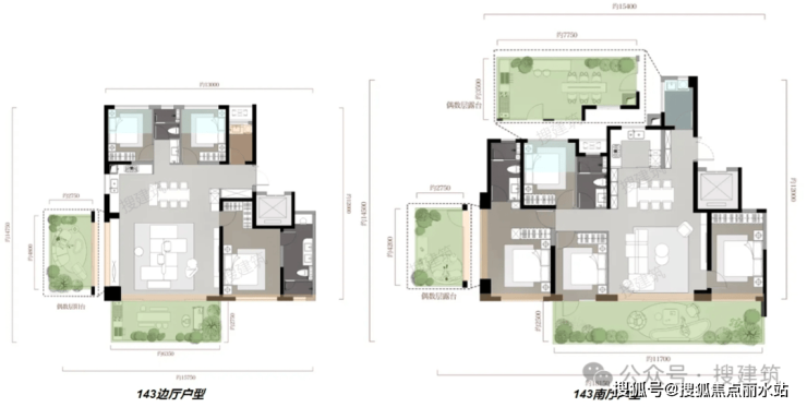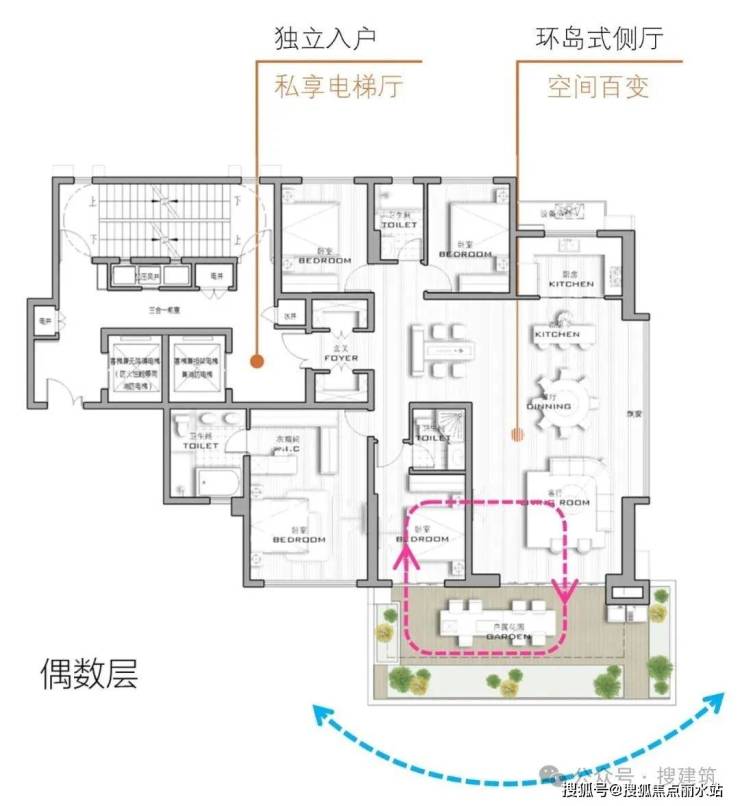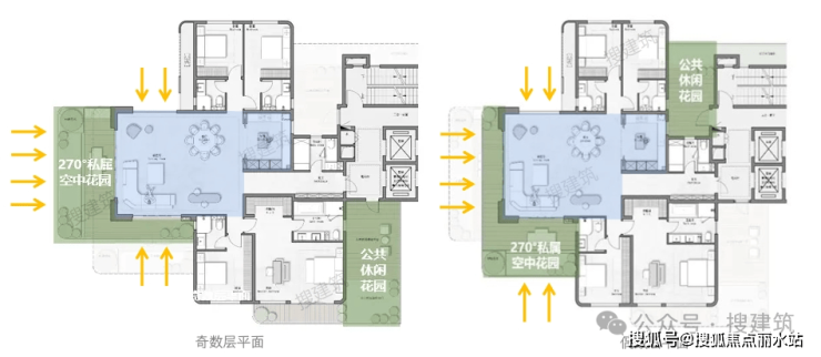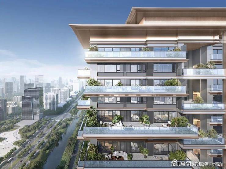 比如,福州国贸天琴湾,客餐方厅整体凸出,形成360°侵入式端厅,270°生态景观花园始终围绕客餐厅奇偶层错位设置,家庭生活中所有的公区活动都可以与室外有机联系。每一层住户都可以从客餐厅任意位置进入私属空中花园,无差别体验新型生态住宅带来的阳光和空气。