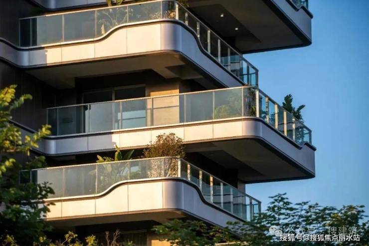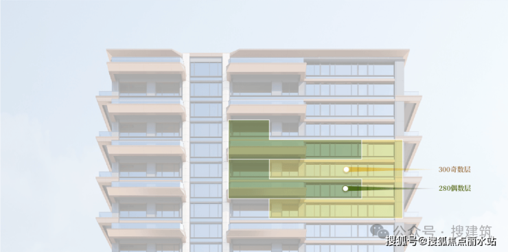 比如,越秀铁建·西派天悦为保障下层住户能享受到充足的日照,巧妙地将露台外侧结构采取倾斜化设计,同时,也创造了奇偶数楼层露台外挑轮廓交错变化、流动轻盈的立面效果,这看似简单的一笔,却蕴含着对人居环境的深度考量。
