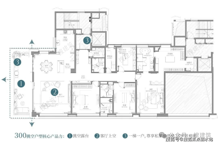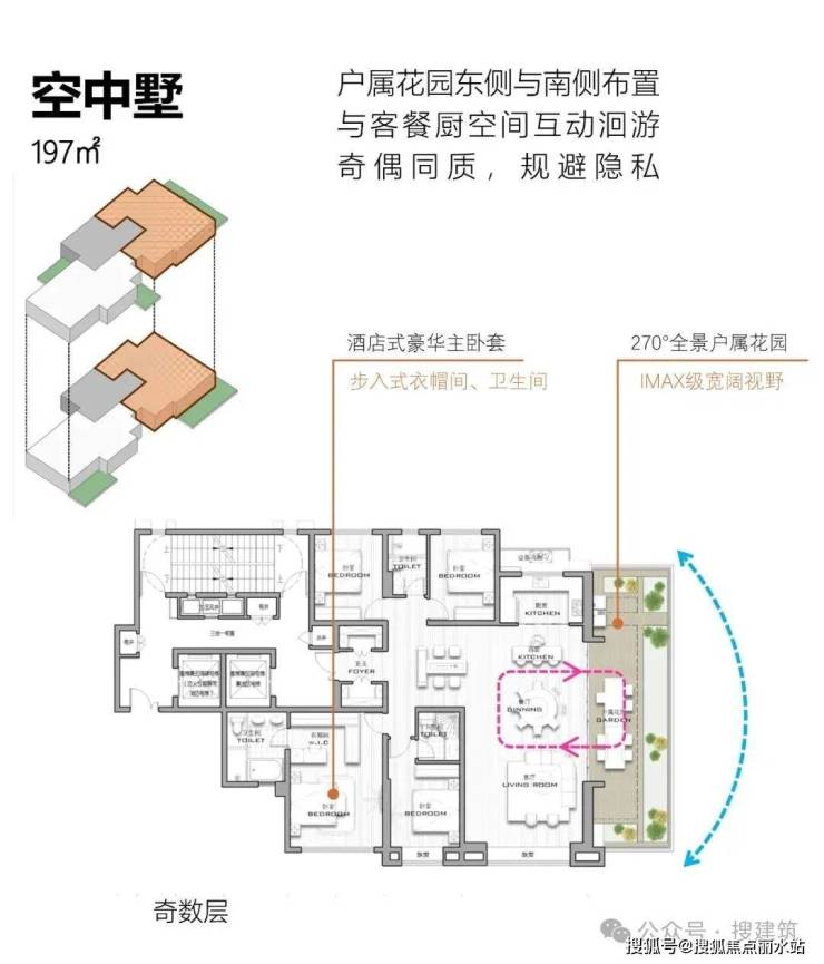 墅厅大平层+露台设计,通过客餐厅局部挑空,高度上增加,来解决采光问题,是第四代住宅的天花板级别做法。