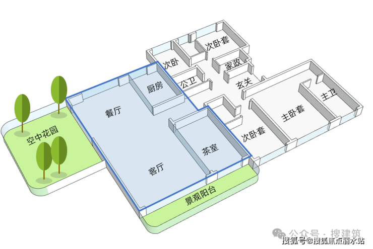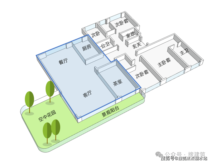 1、「端厅+露台」设计,打破单面采光的桎梏