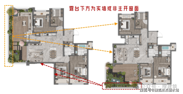 大露台要规避主要采光朝向,即:一般来讲,减小主要采光面的南向露台尺寸。将大尺寸露台设置在非主要采光面上,一般为侧面/山墙面。