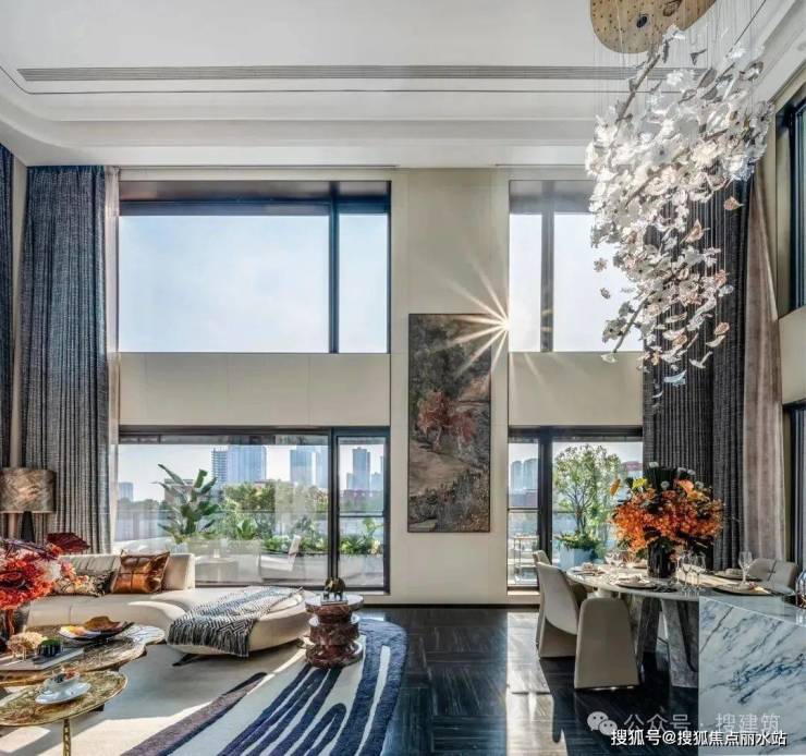 餐客厅空间南、西、北三面均为大面窗,加之约6.6米层高,形成“立体化”观景视窗,纵向+竖向双维拉升采光观景面,直接抹掉室内外界限感,让户外景观无界融入室内,这是普通大平层无法超越的极目视野。