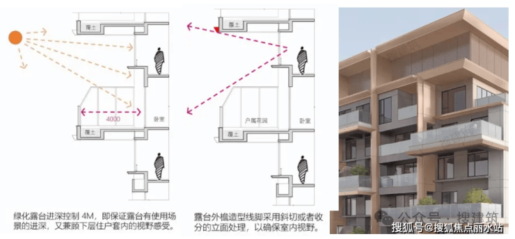 需将露台进深限制在3.0-4.2米(3.6米更佳),既满足使用需求,又避免对下层形成大面积阴影。