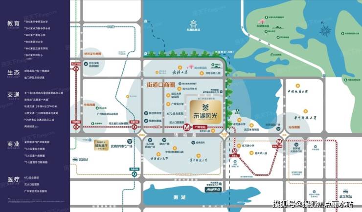 东湖风光位于大武昌的核心地段,距离珞瑜路街道口商圈很近,周边商业、大学、医疗等各项资源配套十分也丰富,相关配套放眼大武昌也是非常能打的存在。同时项目位于二环旁,交通出行是非常便利的,无论是自驾还是乘坐交通工具都是有一定优势的。比较有特色的一点是项目大部分房源可看东湖,而且项目靠近武大与东湖,人文环境确实不错,入住体验是比较值得期待的。