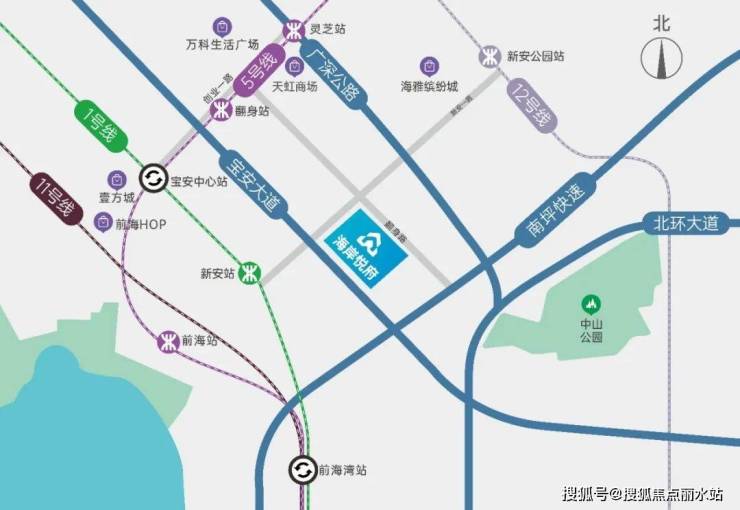 地铁:距离1号线新安站1km内(直线距离),1站到宝中、3站到前海,1、5、11、12号线四条地铁线路通达各片区核心。