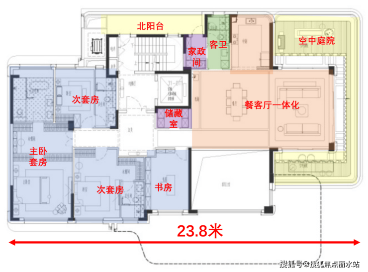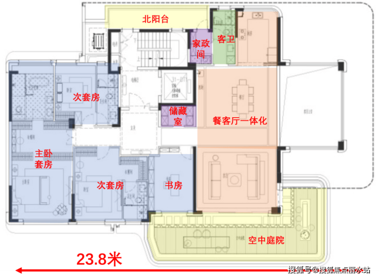 整体户型为4房4卫的布局,三个套房+书房,南向开间约23.8米,东侧空中庭院,北侧有北阳台,相当于三面采光,十分通透。