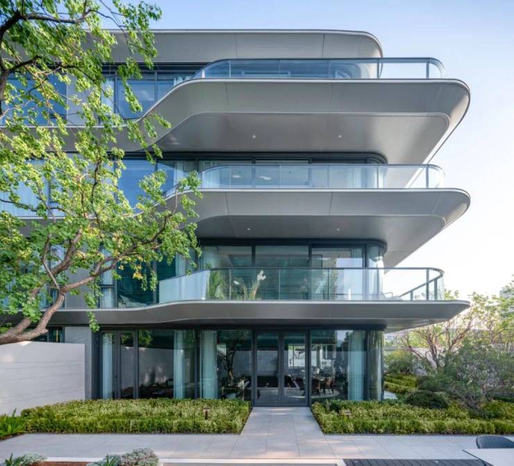 为使自然优势能最大化利用,建筑立面采用皓月银铝合金面板配合大面积的落地窗,自然景观面被大大拓宽,室外优质景观与内部空间相互交融,整个建筑由外而内浑然一体,和谐共生。