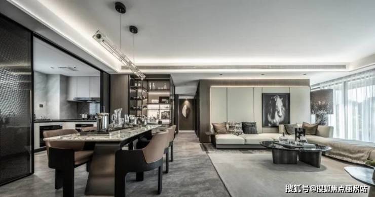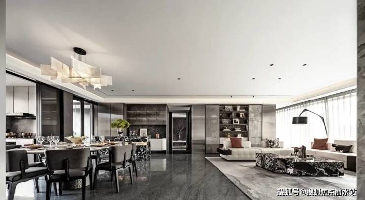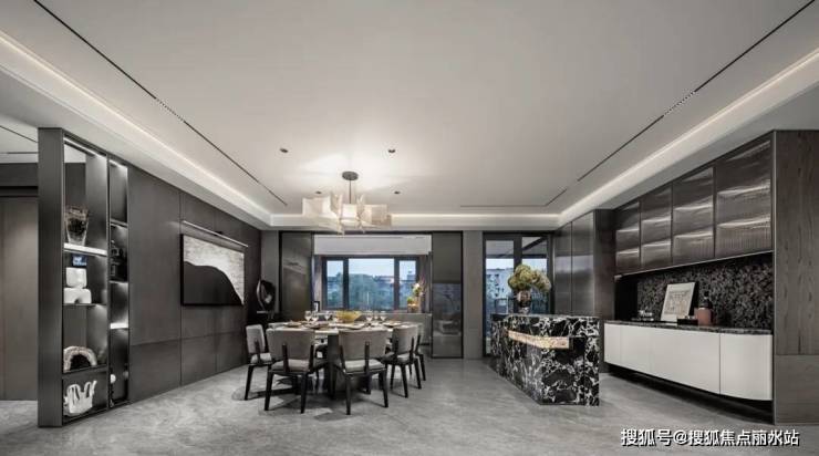 餐厨区域着重对生活品质的渲染,金属质感的厨房收纳更能激发出大体块空间的力量感。黑白大理石岛台成为空间焦点,艺术吊灯融入船帆的元素,使空间的仪式感在细节处绽放。
