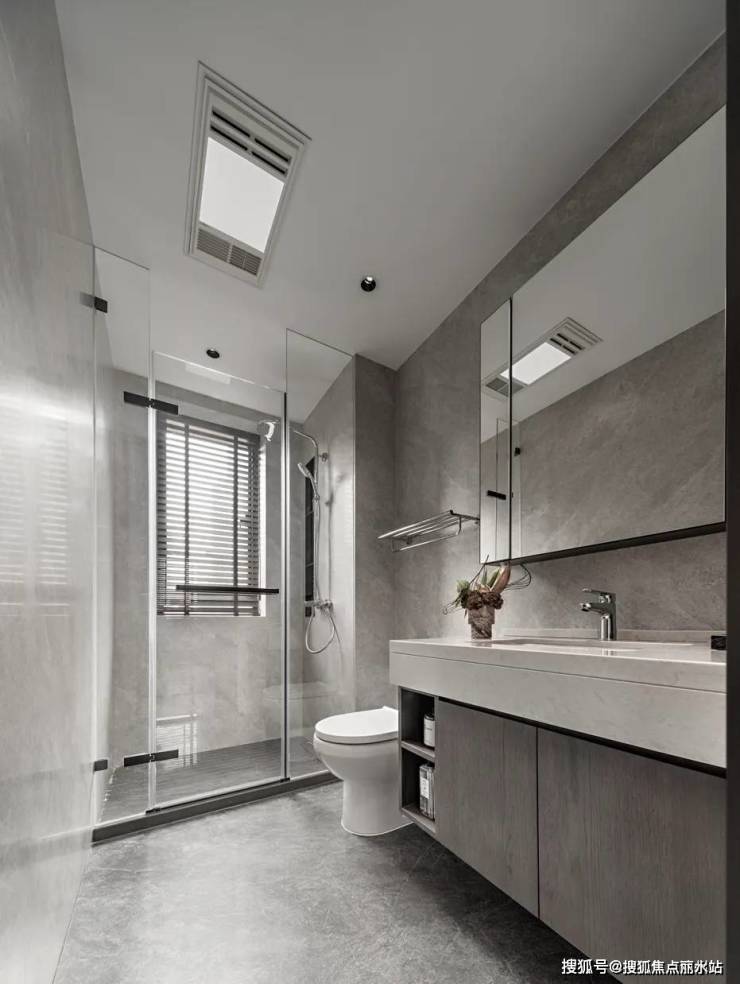 步履停在公共卫生间,一字淋浴屏将干区与湿区完美划隔。镜子后隐藏收纳柜,细节处不乏精致生活的考究。