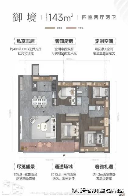 143㎡户型亮点:约43㎡LDKB无界方厅,社交化场域;全明中西双厨,可实现全南北采光;可拓展X空间,奢适主题自定义;约8.6m宽幕阳台,尽览四季盛景;约12.8m南向面宽,通风、采光更佳;约4.2m面宽主卧,套房级奢享。