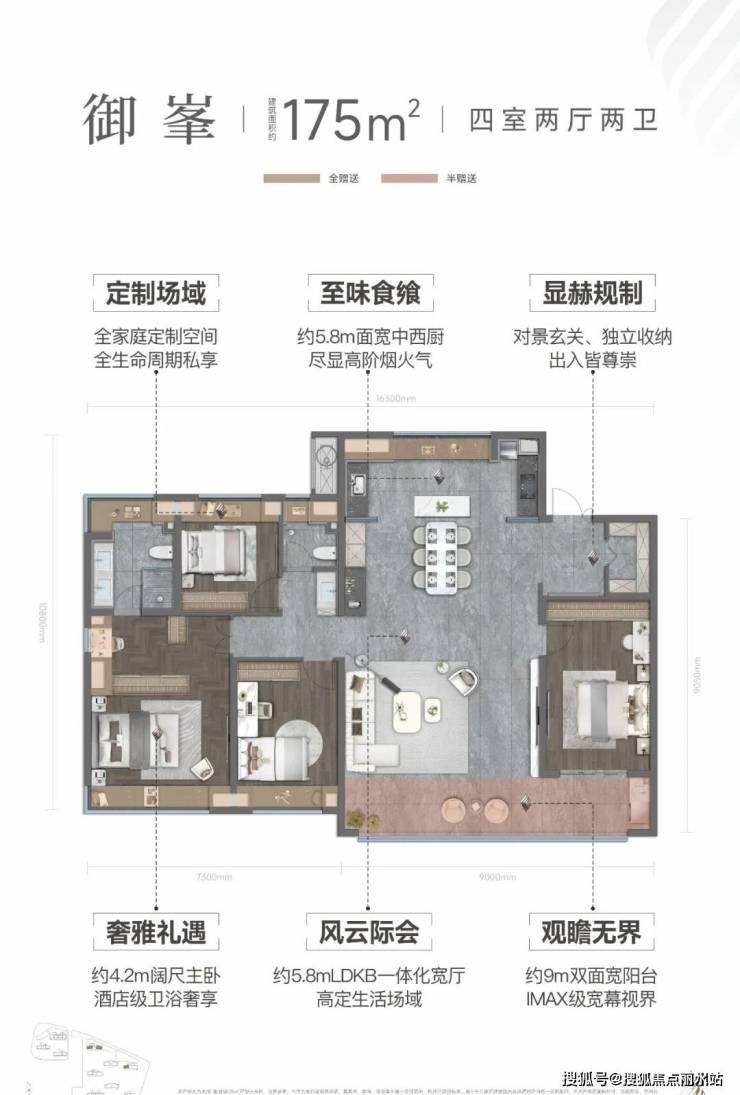 175㎡户型亮点:对景玄关、独立收纳,出入皆尊崇;约5.8mLDKB一体化宽厅,高定生活场域;约5.8m面宽中西厨,尽显高阶烟火气;约9m双面宽阳台,IMMAX级宽幕视界;约4.2m阔尺主卧,酒店级卫浴奢享。