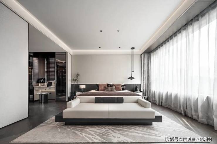 采用LDKB一体化设计,提升了通透感,更拥有“洄游动线”。IMAX级别的落地窗,打破室外、室内的界限。主卧大床搭配270°转角的大窗,观景面和视野拉满。