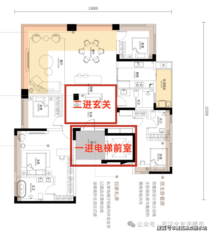 另外,独立电梯前室、全屋360°采光,主卧、北向次卧270°视野