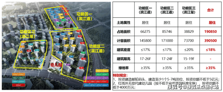 滨江道/玺项目由3个功能区组成,整体占地19万方,总计容面积39万方,纯居住属性, 须签署投资协议在红线外投资建造邮轮码头 ,投资总额不低于5亿元;无偿代建幼儿园(按不低于省优质园标准实施),投资总额不低于4000万元。项目成交总地价约58.69亿元,折合楼面价约15029元/㎡;含固投总地价约64.09亿元,折合楼面价16412元/㎡。