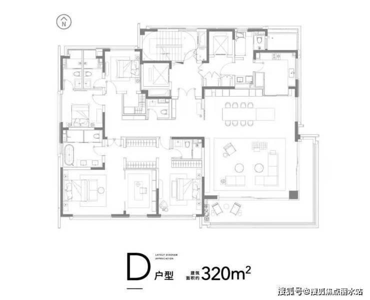 320㎡户型 一层一户 :①双电梯、双动线入户设计让空间更灵活,业主和家政人员动线不重叠,兼顾安全性和隐私感;②大开间朝南,户型采光通透,L型270°观景阳台,全方位享受江景景观,视野极佳;③LDK一体化设计,生活动线流畅,方便家庭成员情感交互;④四卧室全套房设计,其中双主卧套房,尊奢感极佳。
