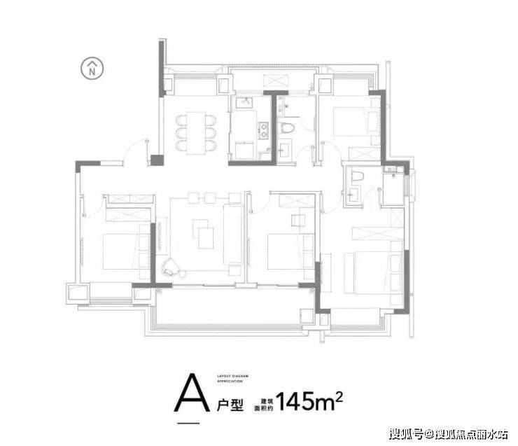 145㎡户型两梯两户:①入户玄关设计,私密度充分;②四开间南向,双联阳台,活动空间和采光面均非常充足,观景效果极佳;③全卧飘窗设计,采光及视野极佳,同时保证高得房率;④客厅与餐厅一体化,空间感强。