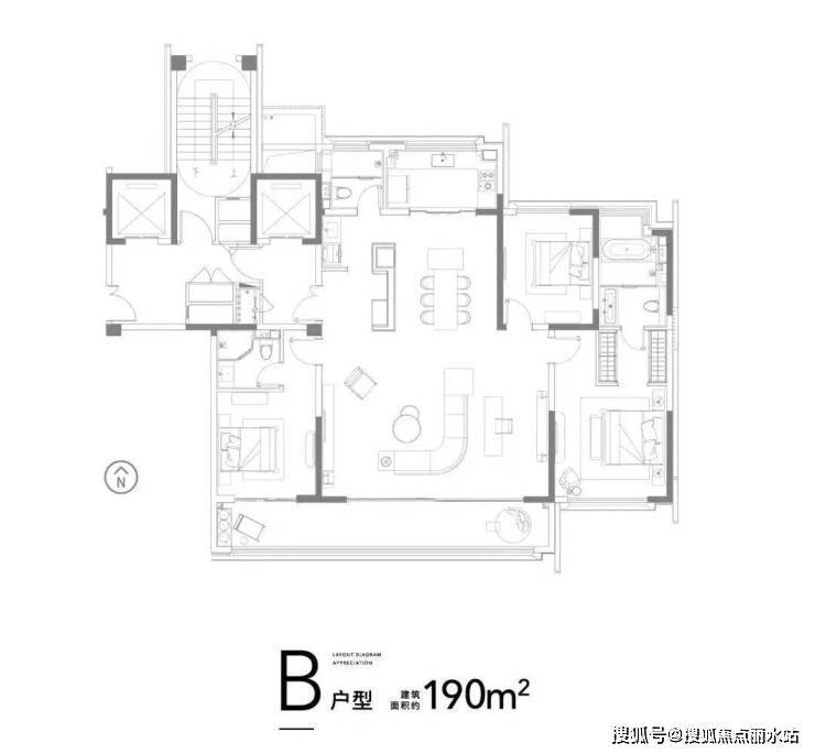 190㎡户型两梯两户:①独立电梯厅入户,独立玄关配置收纳空间,入门双动线规划,往左为家政动线,往右直通客厅, 后疫情时代设计通过入户空间功能划分 ,让业主实现户内外生活过渡自由;②全明空间设计,餐、客、厅、阳台一体化,使家庭核心活动区连贯整齐,空间感更强;③双卧套房朝南,居住舒适度高;④约12米景观阳台,提升采光与通风,同时给予业主更多功能改造空间。