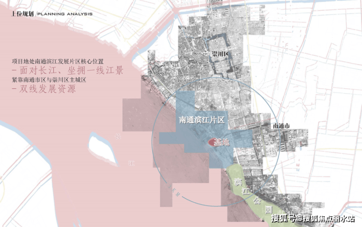 项目位于南通新城区滨江发展区,为滨江板块 首宗商品房地块 。2018年南通市政府与招商局集团签订合作协议,计划在南通主城滨江地区生态修复城市更新方面开展合作,打造集时尚休闲、滨江旅游为一体的 江海邮轮港和南通外滩 ;地块2019年年底挂牌,同期招商蛇口与南通城建集团先行成立合资公司, 合资公司于2021年1月31日底价竞得该宗地块 ,后续开发,南通城建集团纯财投,招商蛇口全权操盘。