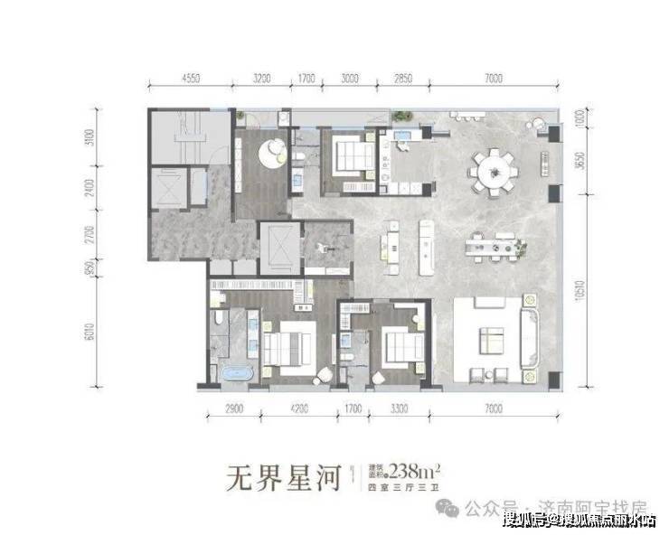 建面约238㎡| 无界星河| 四室三厅三卫私享约7㎡艺术电梯前厅+双玄关,双动线归家系统,中西厨+岛台洄游动线北向约9m生活阳台,约40㎡总统级套房主卧,三分离卫浴&独立衣帽间,搭配约3.2m全景落地窗,约100%私享率,LDKG一体化设计,东向约11.5m落地观景窗&南向约7m奢阔开间,270°IMAX环幕视野